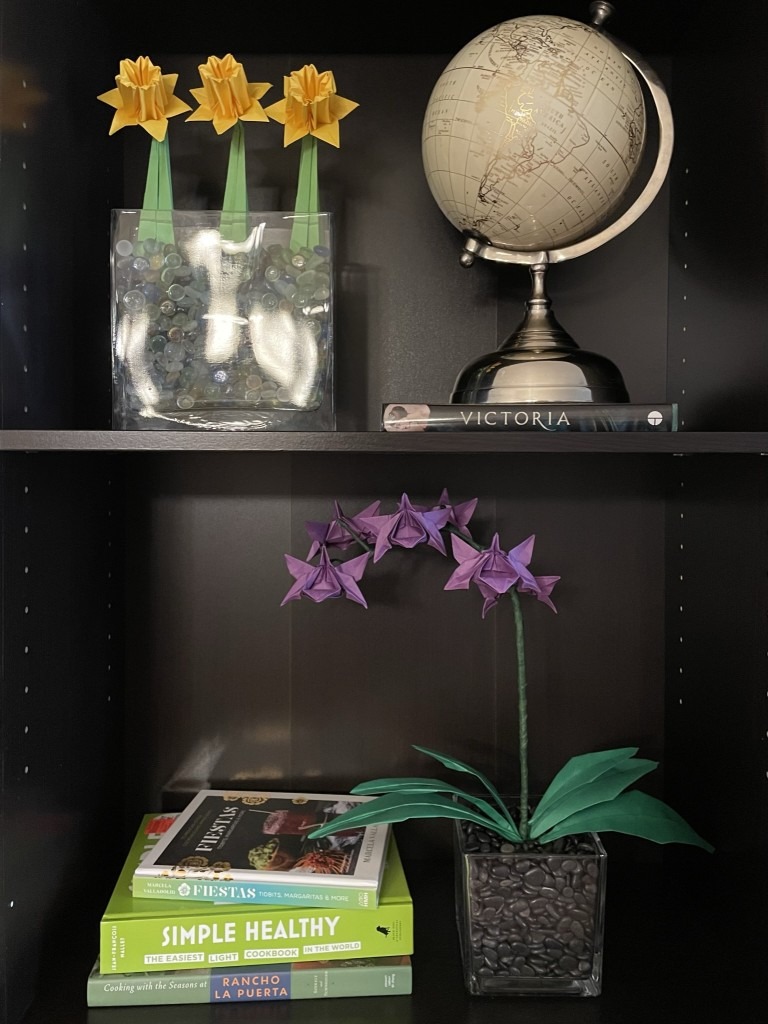 When my friend moved into a new apartment, I made an entire orchid — the whole plant — out of paper, wire and floral tape. I found an old Paul Jackson model of origami daffodils and assembled a trio of these as well.