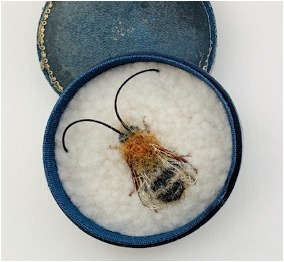 The artist is Lydia Needle from Somerset, UK.  Her delicate felted bee embroideries seated in a variety of containers, ranging from ring boxes to vintage compacts, tins made for pills and assorted hardware – are so intimate and captivating.
