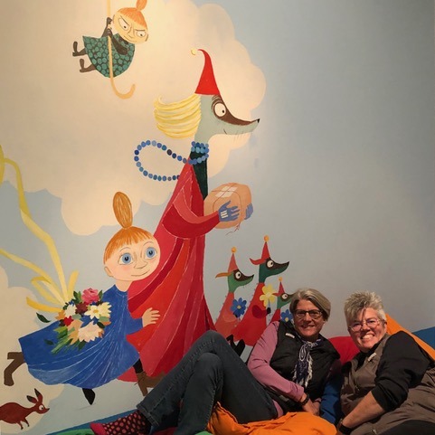 The writer and her wife at HAM in 2019 with a rendering of Moomins – photo by SK Sandeen