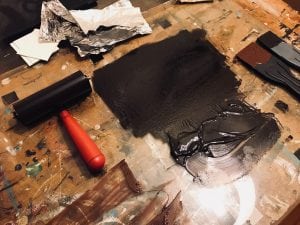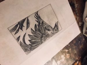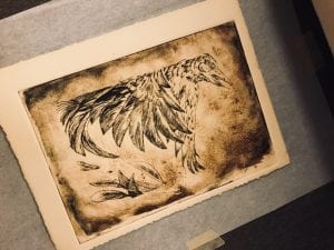 After spending a full weekend devoted to pulling single plate prints from my etchings, I decided to try and experiment with texture and color. In keeping with my goals for this grant, I wanted to try something different by being more experimental in my approach to these processes.