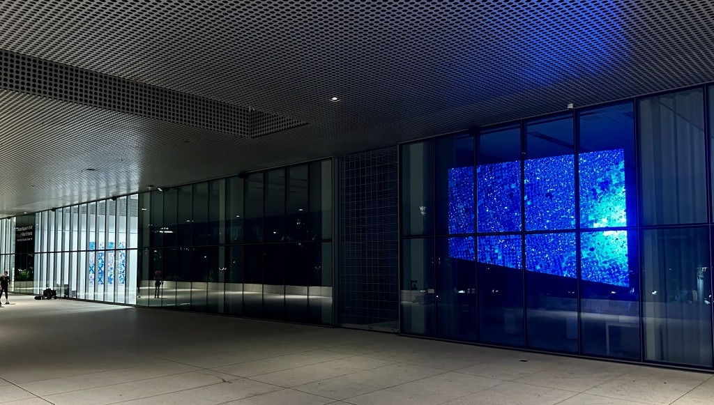 There’s Will Douglas’s Finland setting Sun triptych banners hanging between the columns on MFA’s façade.