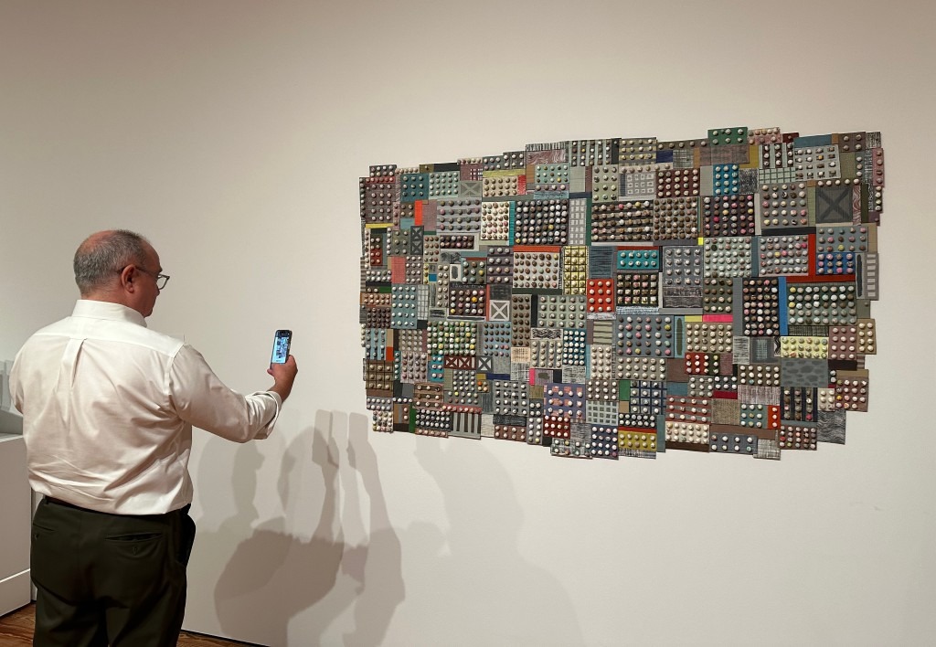 Down the road at SAM is Motherboard by Sue Havens. Many artists have used computer motherboards as a cityscape metaphor. Havens, professor of painting and drawing at USF, made her Motherboard not from electronic parts, but from rolling up notes, test papers, junk mail and various ephemera into little balls and organizing them on flattened Amazon boxes while attending Zoom faculty meetings during the Covid lockdown. This gridded cityscape also look like a display of boxes of chocolates.