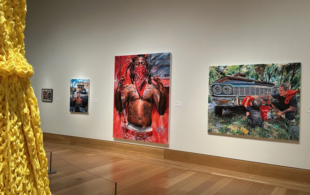 Michael Vasquez’s paintings at the Ringling explore the street scenes in his neighborhood. “The resulting paintings are rich with coded visual cues that inform identity. . . These elements, along with pose, gesture and expression, all come together to legitimatize a complex emotional landscape and social dynamic. . .”