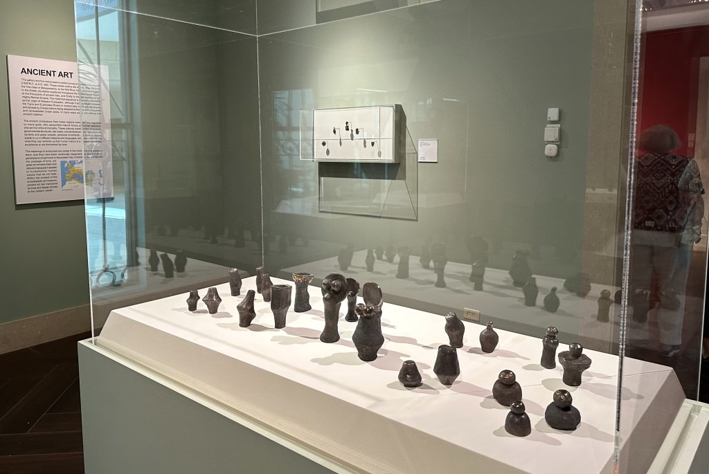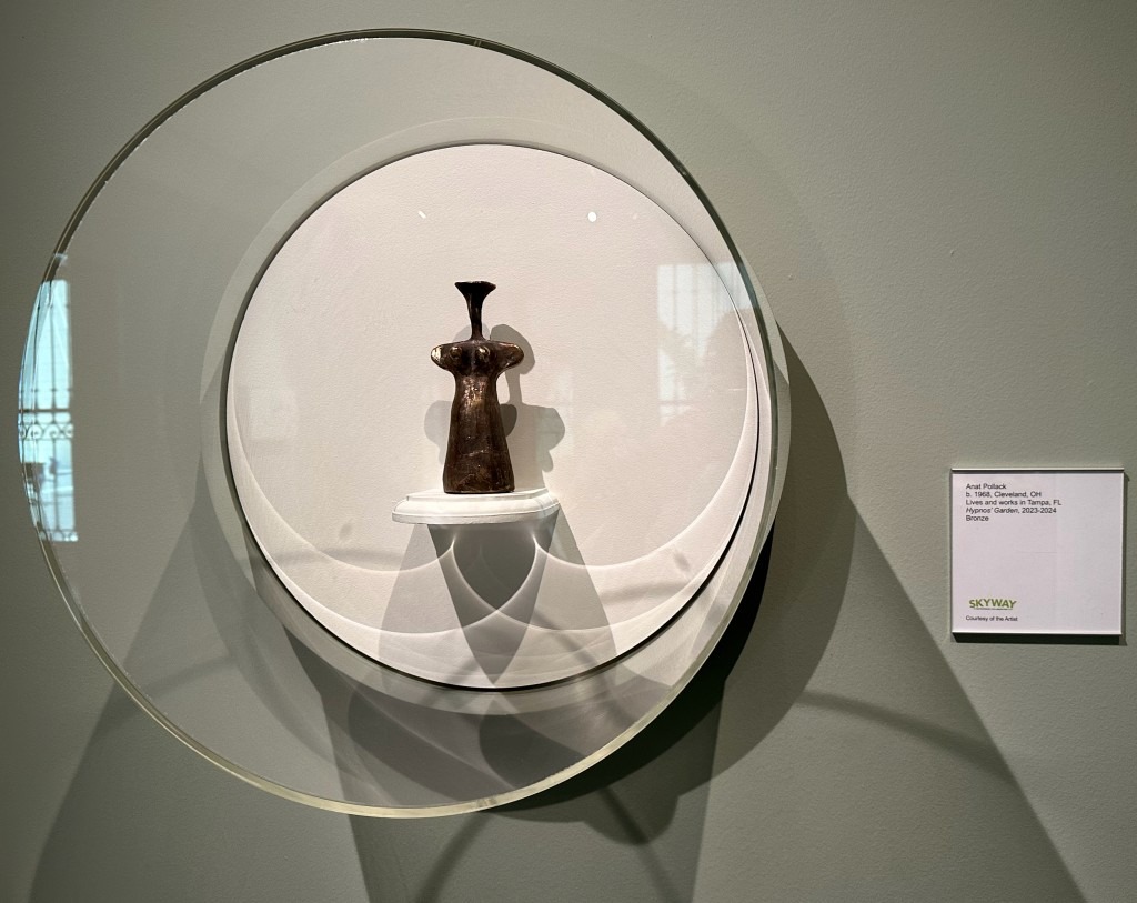 In the connecting galleries, if not for exhibition labels with the Skyway logo, one could easily mistaken several groups of small bronze objects in Anat Pollack’s Hypnos’ Garden as part of the museum’s collection of figurines, torso fragments, fertility figures, pottery shards. . . remnants from ancient cultures.
