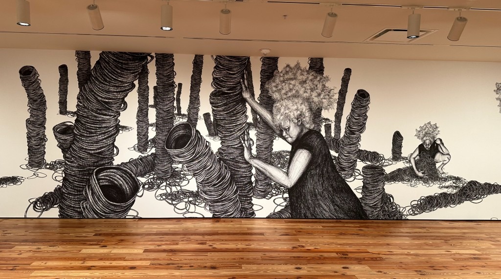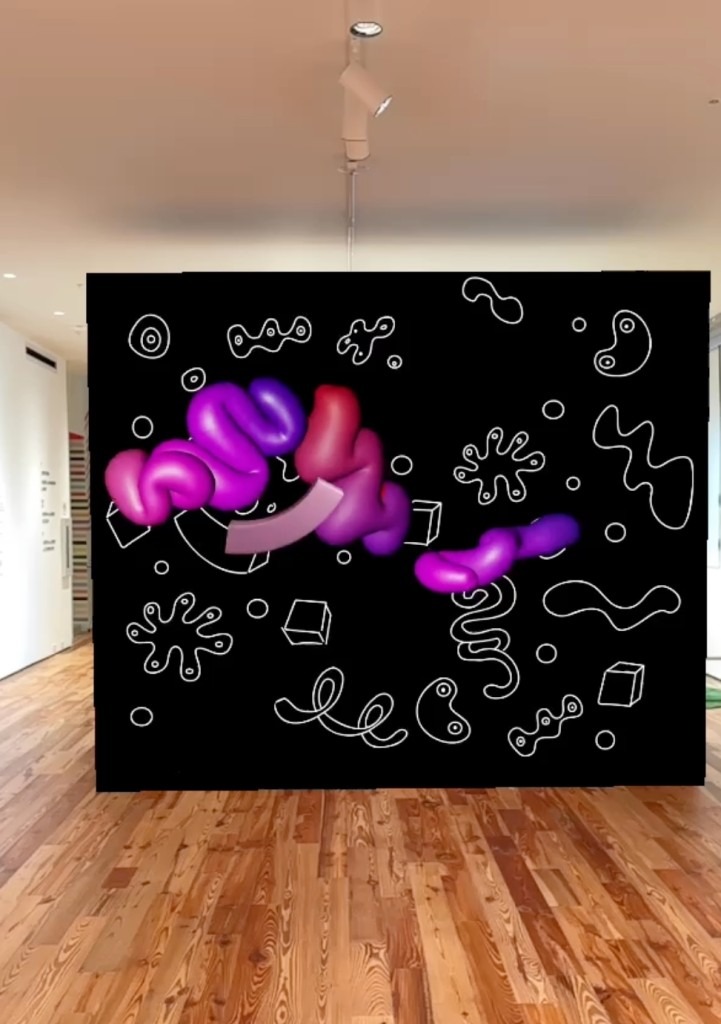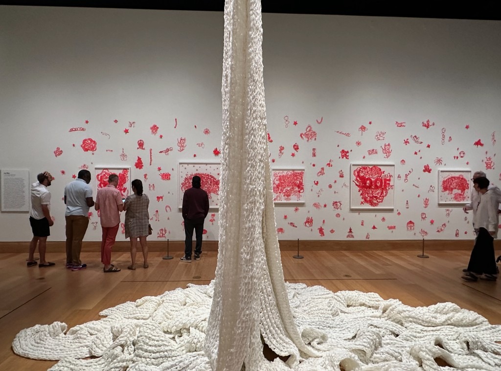 Jill Taffet’s Sentient Beings has a QR code link to download an app to fully engage her squiggly wall drawings at SAM.