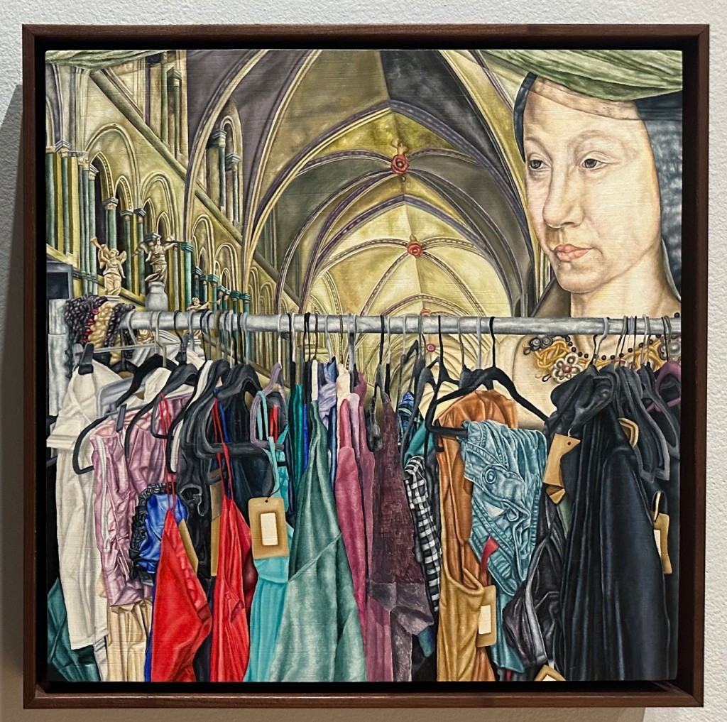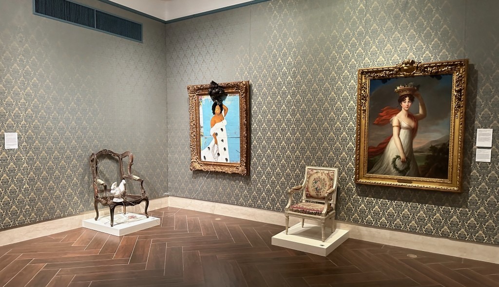 A double take is Kendra Frorup’s 2023 portrait of her daughter hung next to Elisabeth Louise Vigée Le Brun’s 1799 portrait of her daughter, with both daughters in the exact same pose.
