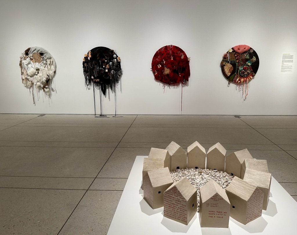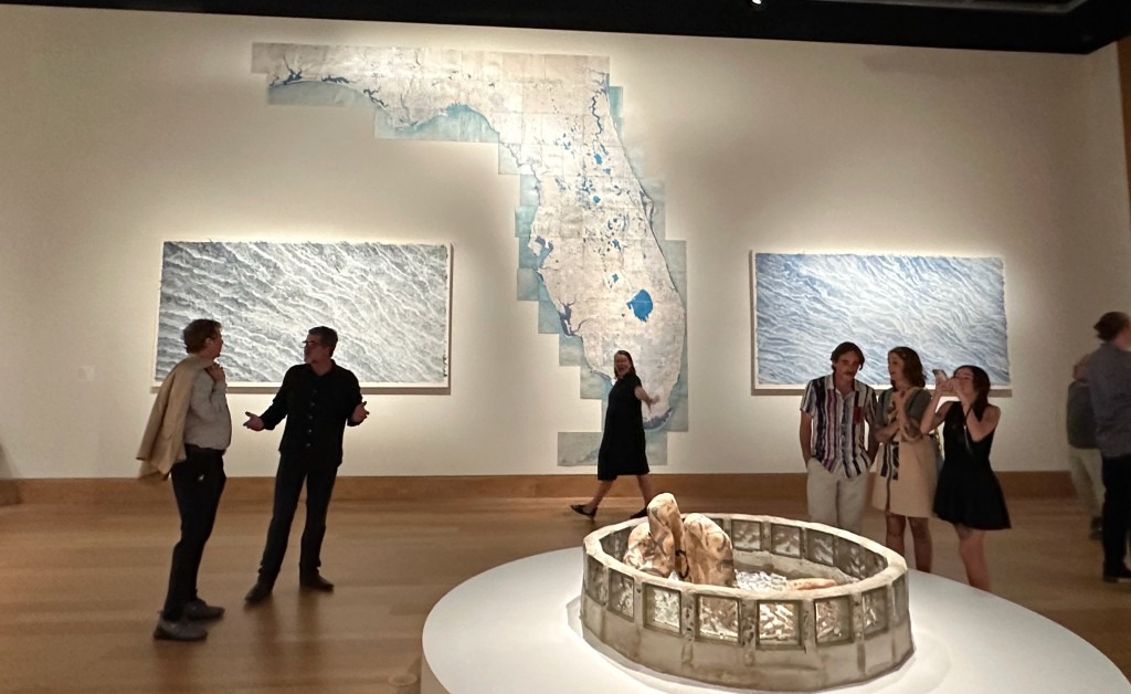 That one inch object is a brooch at the Ringling’s Skyway, part of a collection of jewelry crafted by Caitlin Albritton. Rarely do art exhibitions include jewelry, which often has its own category – but here they are right in front of Jake Fernandez’s massive topological paintings, and side by side with Libbi Ponce’s anthropological sculptures.