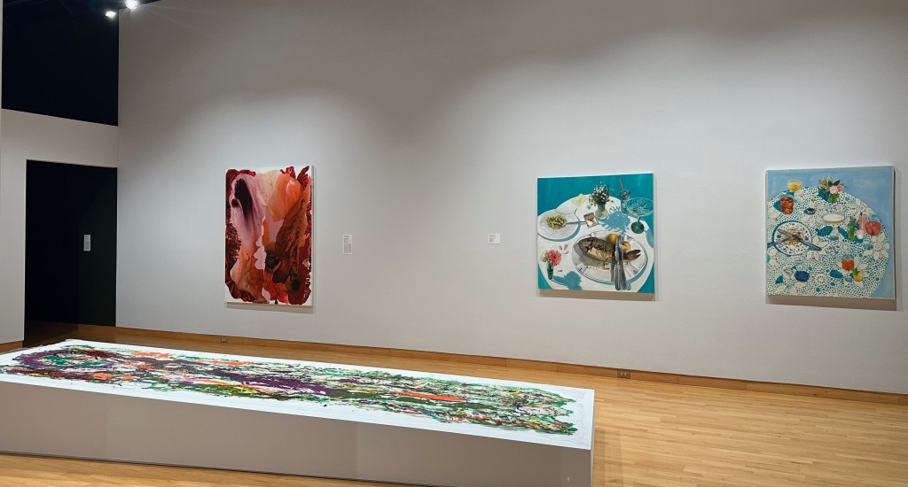 Blurring these lines are Sebastian Ore Blas’s intimate table-scape paintings – mini tableaux, closer to still lifes pointing to identity. Two particular pieces, Fishy Things and Solstice, both table settings floating on cool pools of blue are hung next to Elisabeth Condon’s complementary colored Burning Embers – a painting with deep orange-reds like flowing lava, like visiting Iceland’s volcanic landscape, walking its geologically carved fields, then submerging into Blue Lagoon waters.