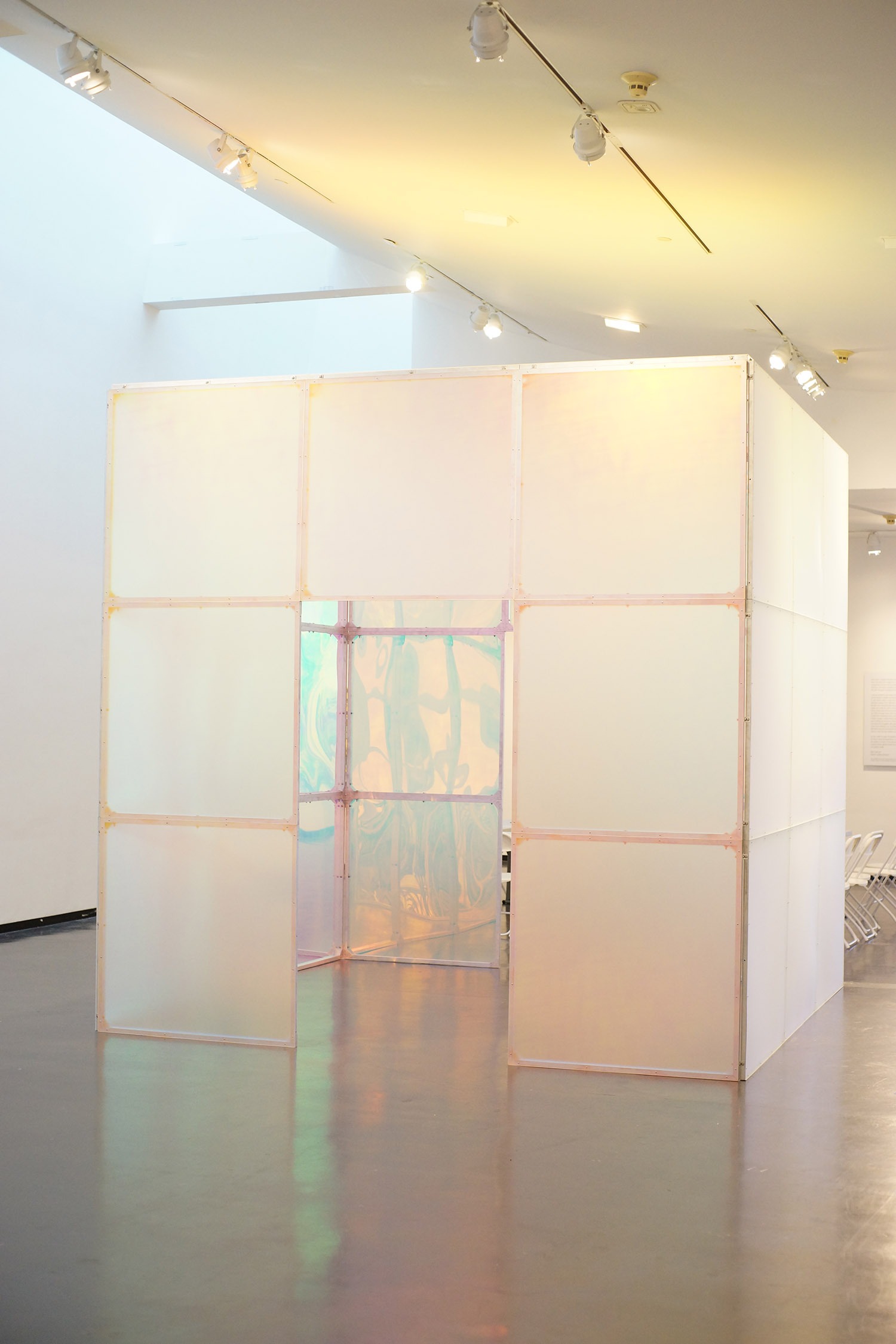 Not far from Rachel’s pieces stood the massive piece by Alex Kaufman, glowing and sheer all at once. The enormous object was open on two sides allowing people to pass in and out of it, as they had all night.