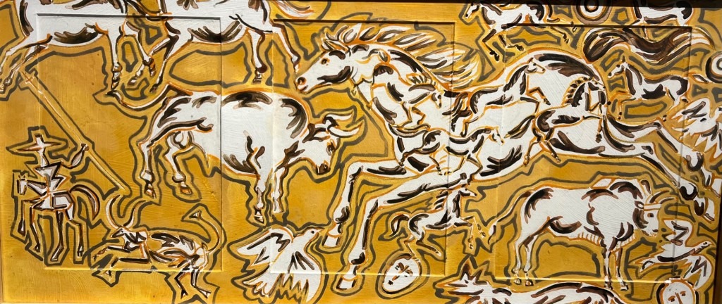 The gouache polyptych of four interrelated framed panels creates one piece of exceptional art. His artworks are painted with oil, acrylics or gouache mediums.