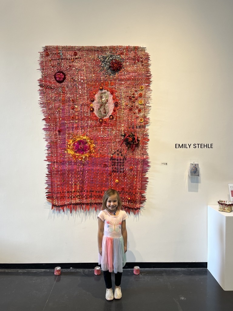 When we walked into the first room to the right, Madeline was drawn to the mixed-media work of Emily Stehle who weaves unconventional materials to make decorative sculptures. Madeline herself loves to shred, cut and paste so it was nice to show her that a love of crafting and weaving can flourish.