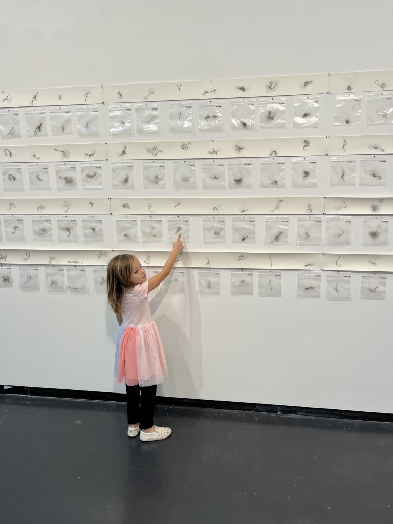 In the adjacent room William and Madeline had a lot of fun locating the hair samples replicated in the large drawings or Hair Doodles by Babs Reingold. Each hair sample and small sketch is dated. Working together, William and Madeline went back and forth. They really enjoyed the puzzle nature of this work.