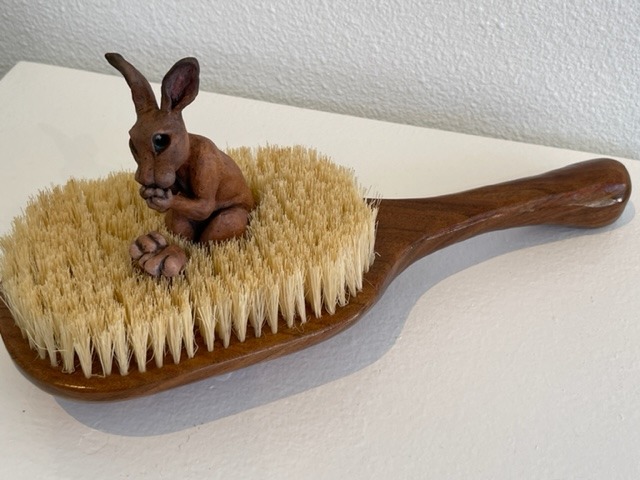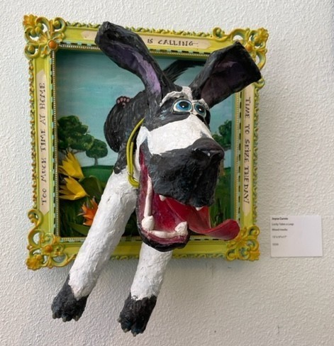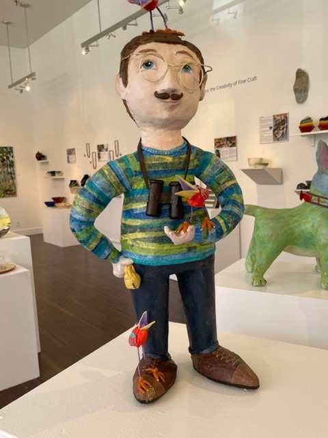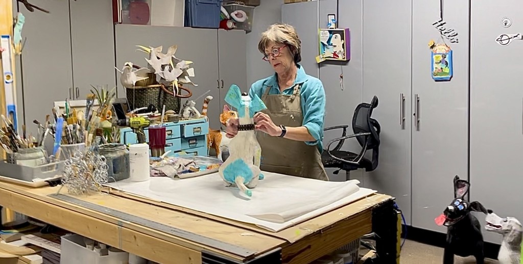 She learned to sew, build and invent with all sorts of tools and materials. They had a lot of animals. She finally settled on papier-mâché and creates a wonderful family of humans, dogs, cats, rabbits, birds and other animals that live in a fantastical, happy and humorous world. She resides in Palm Harbor.