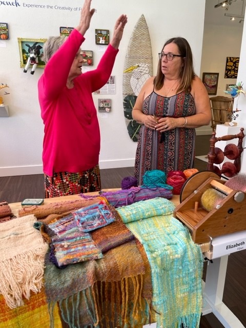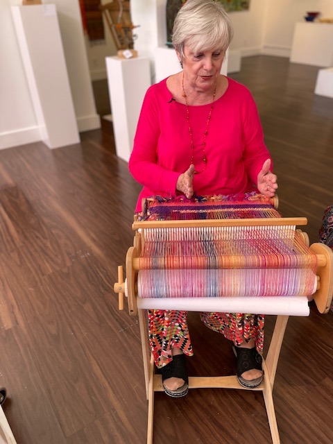 I did get a chance to chat with Fiber Artist Elizabeth Neily of Gulfport during one of her early demonstration days. She was weaving her handspun yarn on a portable floor rigid heddle loom. The loom itself is narrow, only about 15 inches wide, which means the finished woven piece would only be about 14 inches wide, suitable for a scarf or shawl.