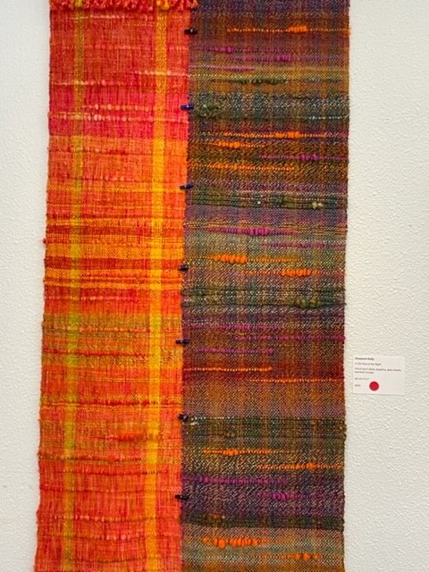 Her wall hanging on display in the Gallery, In the Heat of the Night, woven out of hand-spun wool, Angelina (a heat bondable iridescent fiber) and glass beads is actually constructed from two scarves. A fortuitous marriage of two works, so to speak. Someone purchased In the Heat of the Night, then someone ordered a commission.