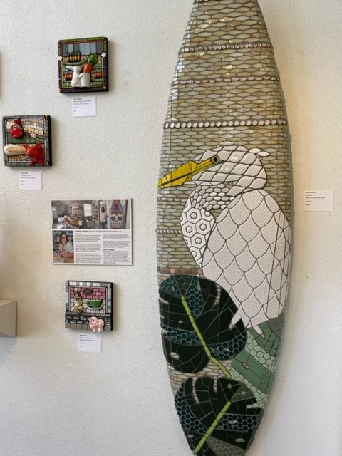 In 2018 – on a fluke – she made a tile mosaic surfboard shower backer for her community condo pool area. Soon after, she was commissioned to make another. . . her mosaics took off from there. Laurie resides in St. Petersburg.