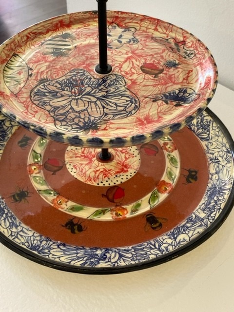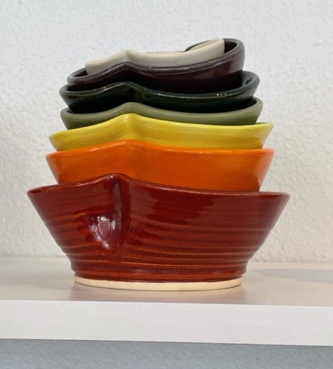 She works with a mid-range red stoneware clay with most of her work handbuilt from slabs of clay or extruded forms. Early inspirations that influence her work are tile work and carvings from ancient cultures, the geometric patterns found in Native American art, stylized art deco designs, mid-century modern designs and contemporary architecture.