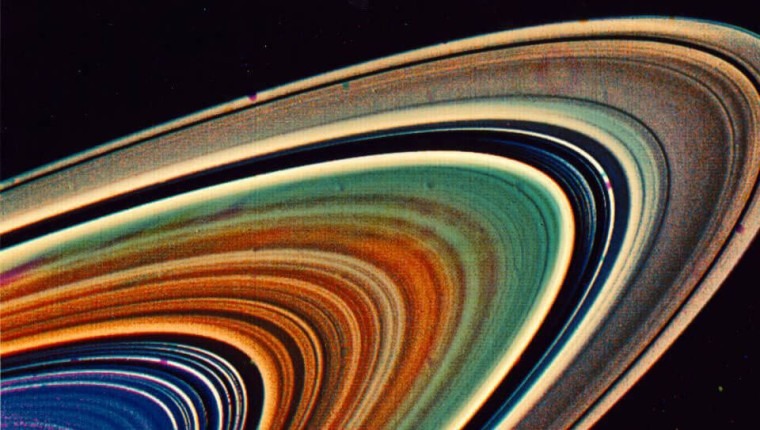 The small color differences in Saturn’s rings have been enhanced in this picture from Voyager 2 data – image by NASA