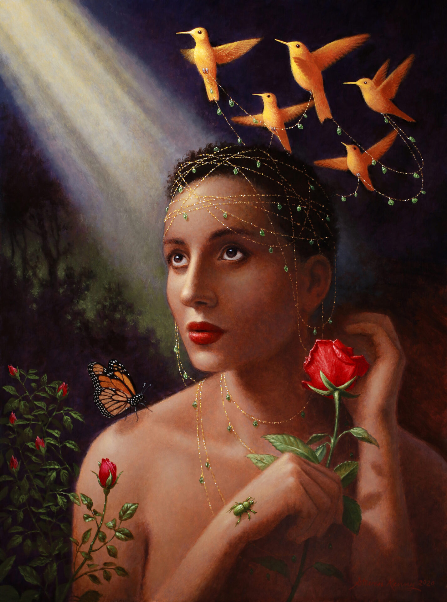 From there I was free to make this painting my own creation. So many of my paintings focus on women with headdresses. So, in this case I decided to keep it fairly simple and have golden birds (kept from the original version) laying fine strands of gilded chains adorned with rough-cut emeralds about her head.