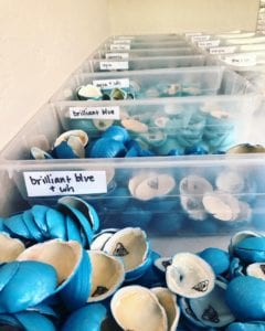 Allow me to walk you through the process I’ve devised to tackle this monumental task. First, I take a shell from each bin, being sure to alternate between buttercup lucine and Pennsylvania lucine. I keep the shells in the same color order as the bins on the table so I create an ombre effect on the finished line.