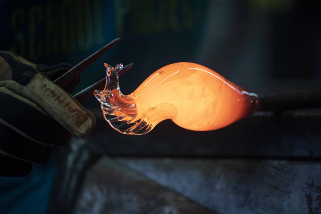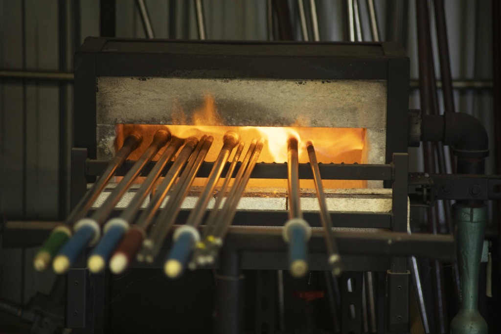 The DMG Project’s mobile furnace is housed there, and it is where Duncan McClellan and a team of glass artists host in-person demonstrations at their glass studio. The hot summer day was compounded by the heat of two furnaces burning in the studio. An oven with open flames had metal rods, used for shaping molten glass, protruding from it.