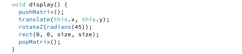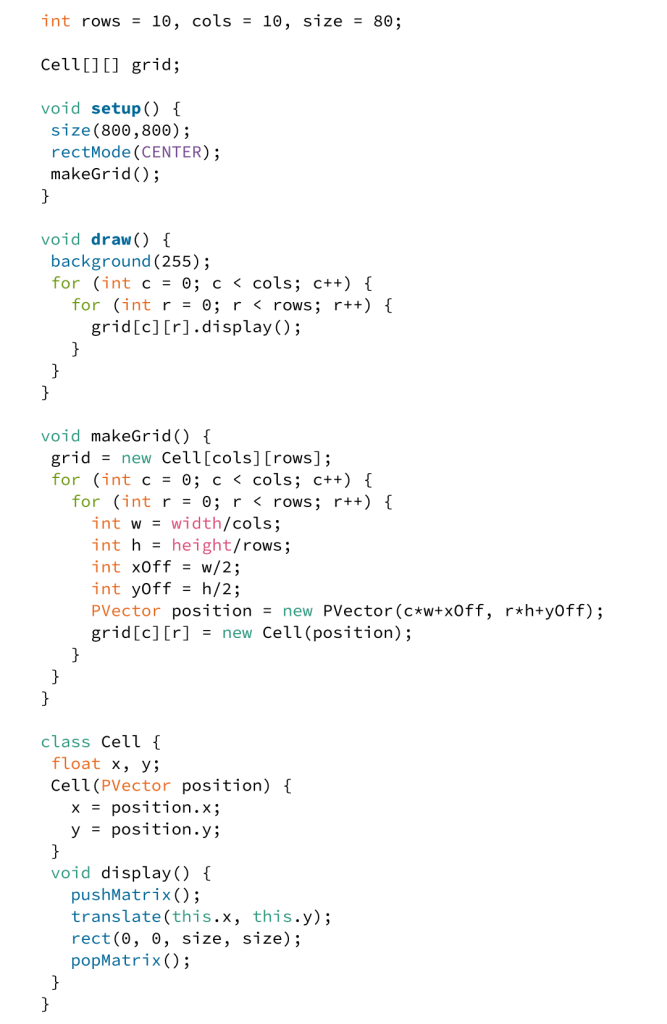 One key benefit of using a grid to produce art from code is that each cell can become a functional unit. Let’s start with a simple example. What if we simply wanted to rotate each cell? Once the grid is established it becomes trivial to compute a transformation.