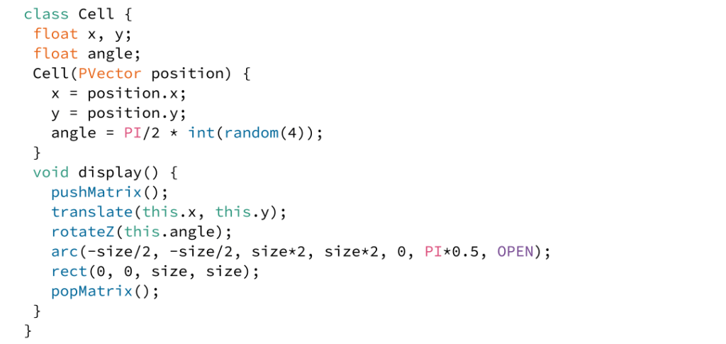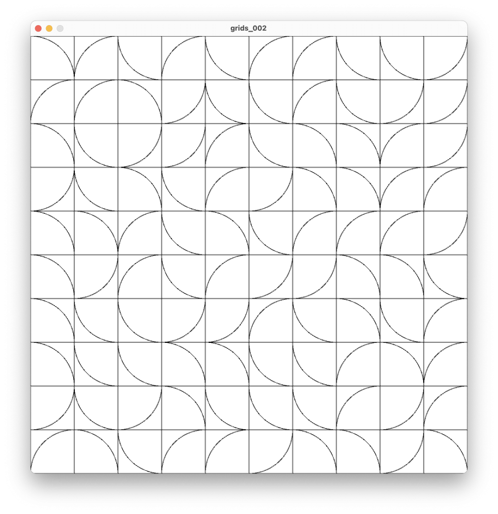 Having the coordinates of each cell stored as variables means that we can easily draw shapes at those coordinates. For instance, we could loop through each of the cells, and draw a curve that is rotated to a randomly selected angle, divisible by quarter PI.