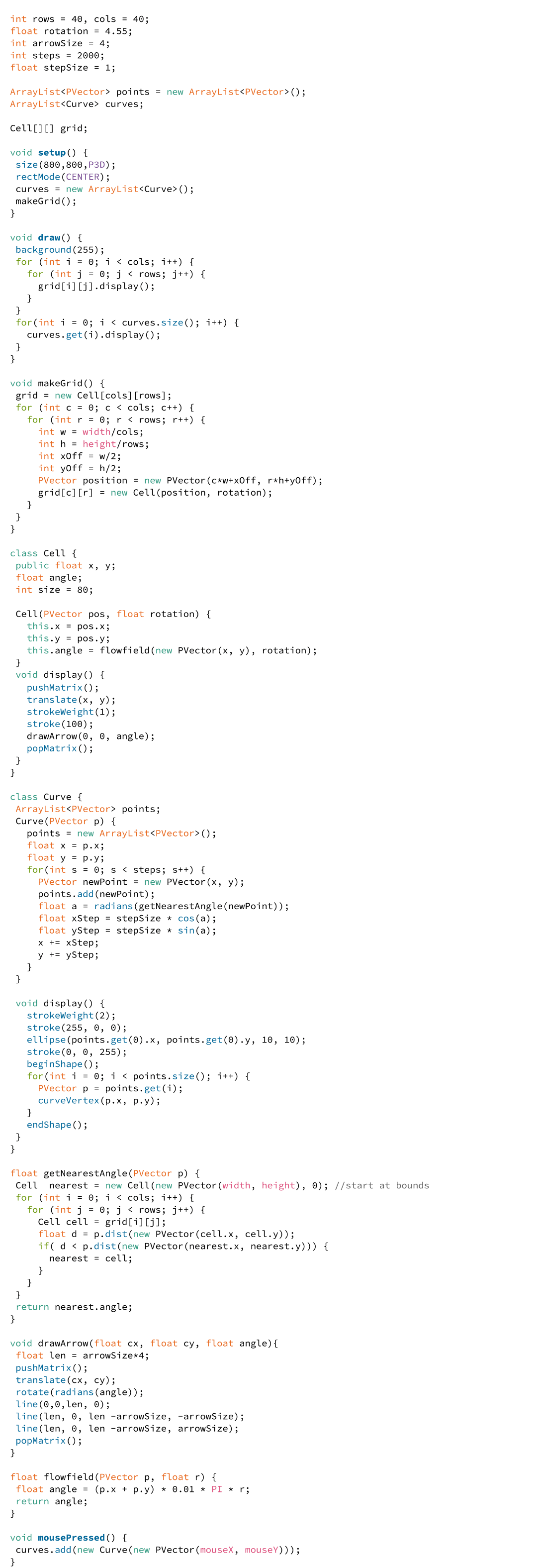 Vector fields, which are based on grids, are powerful tools for generating drawings from code. At each cell the value provides an angle, weight or force that directs the line’s stroke. When other techniques are applied, such as color, opacity and line-width, this method becomes incredibly convincing as an approach to generative drawing.