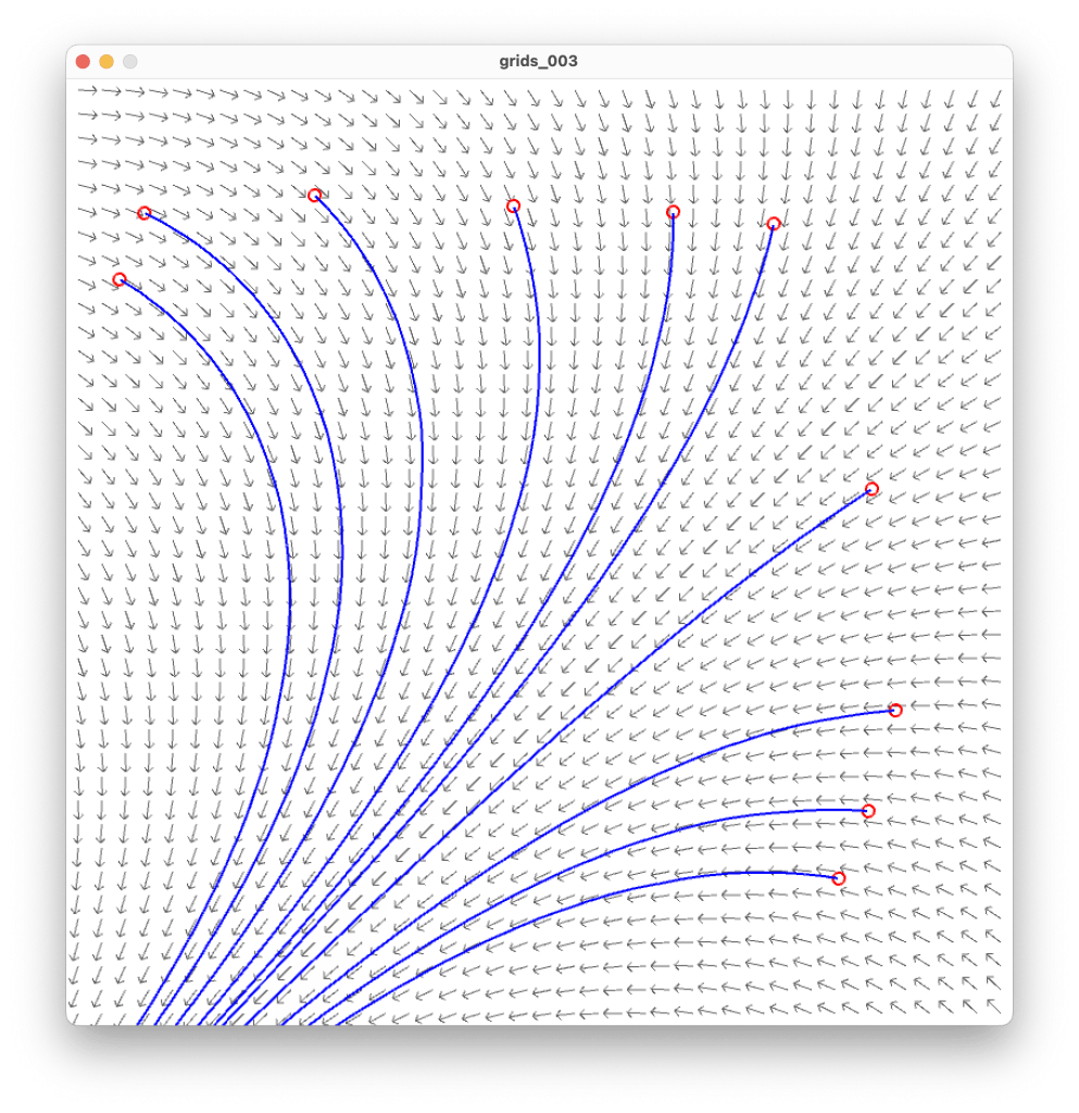 Until now, our examples have all resembled grids. Yet grids are just a starting point in creative coding. They’re not always about seeking the aesthetic of a grid. What’s key is that we can perform computation at every cell of the grid. For instance, we can use the coordinates of their centers to develop a field of values. Using these values, we can steer lines to draw curves that feel organic and natural.