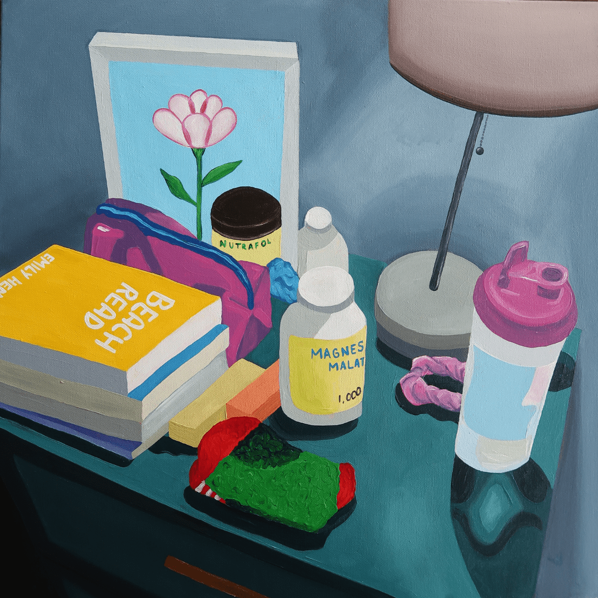 My messy nightstand, with more books than what I can actually read, all the supplements so I remember to take them, a fuzzy sock I use to keep my hair nice while I sleep, a hair tie because why not, a shaker cup since it holds more water than a glass, and a random picture of a flower.