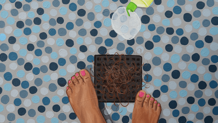 Showering and brushing my hair became unbearable as chunks of hair would fall out all at once. I always had so much hair, and seeing it all fall out without knowing why has been terrible. I decided to represent this moment as a daily struggle. Showering and having to see all the hair falling, right next to a fallen shampoo bottle that says “regrowth”.