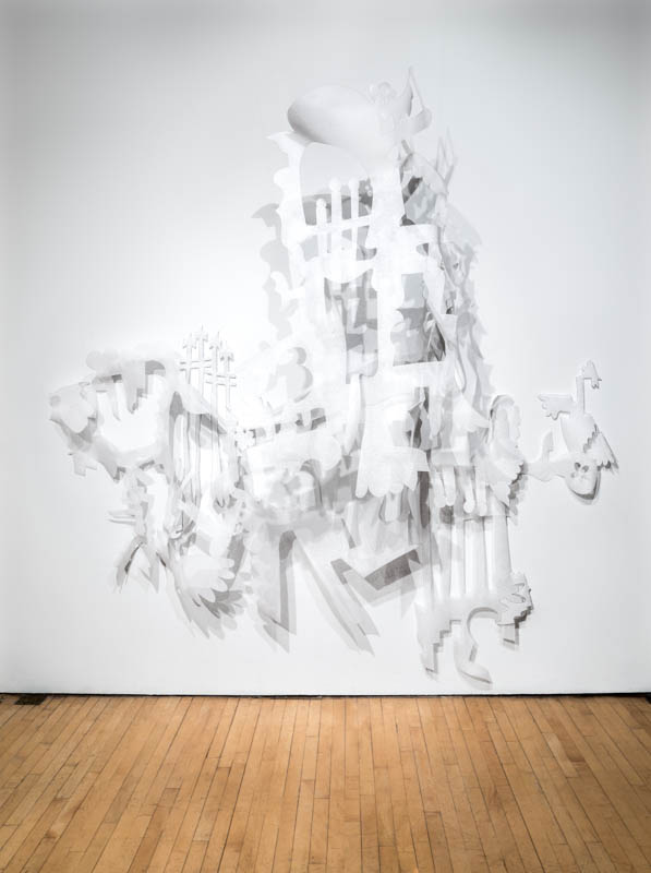 Entre Portones y Verjas, 2017 | Cut buckram | Approx. 10 ft x 9.5 ft x 2 ft | Site-specific installation at Olive Tjaden Hall | Cornell University. Funded in part by Cornell Council for the Arts Grants.