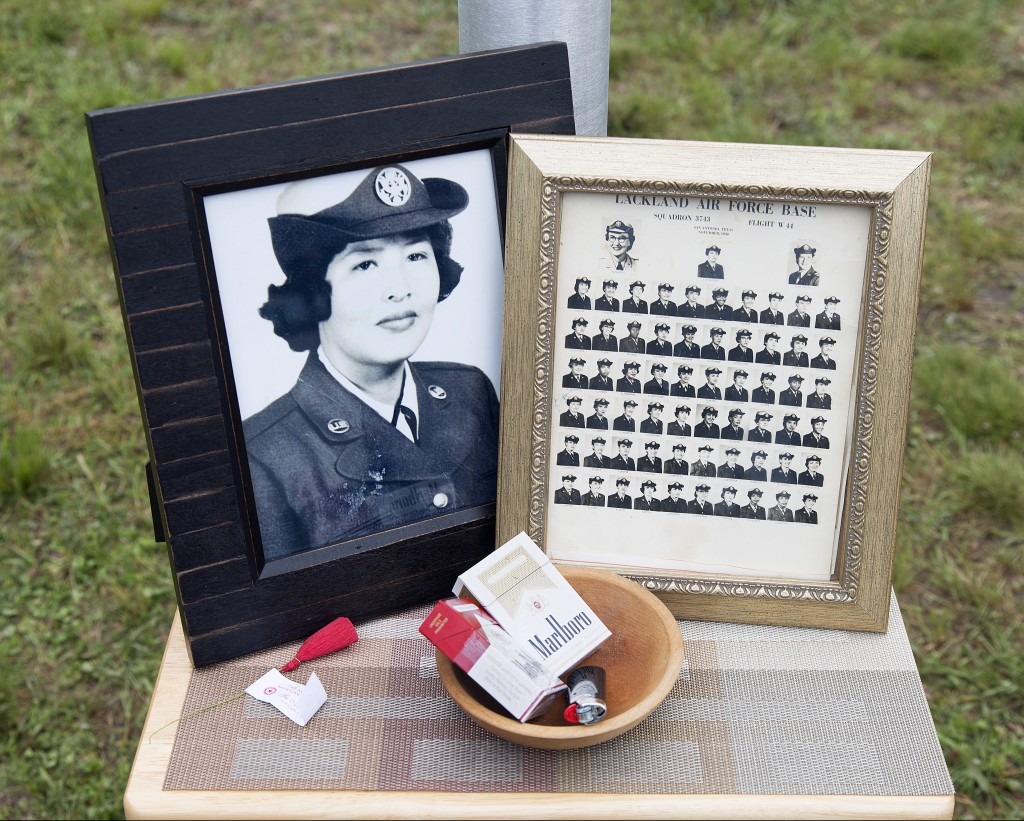 Anna Rae Funmaker (2015) depicts an offering to the deceased. It shows a framed, black-and-white military portrait of a young woman whose cap has a United States Air Force insignia on it. Beside her portrait is a framed, yearbook-style photographic print of her entire squadron that reads ‘LACKLAND AIR FORCE BASE’ and is dated 1936.