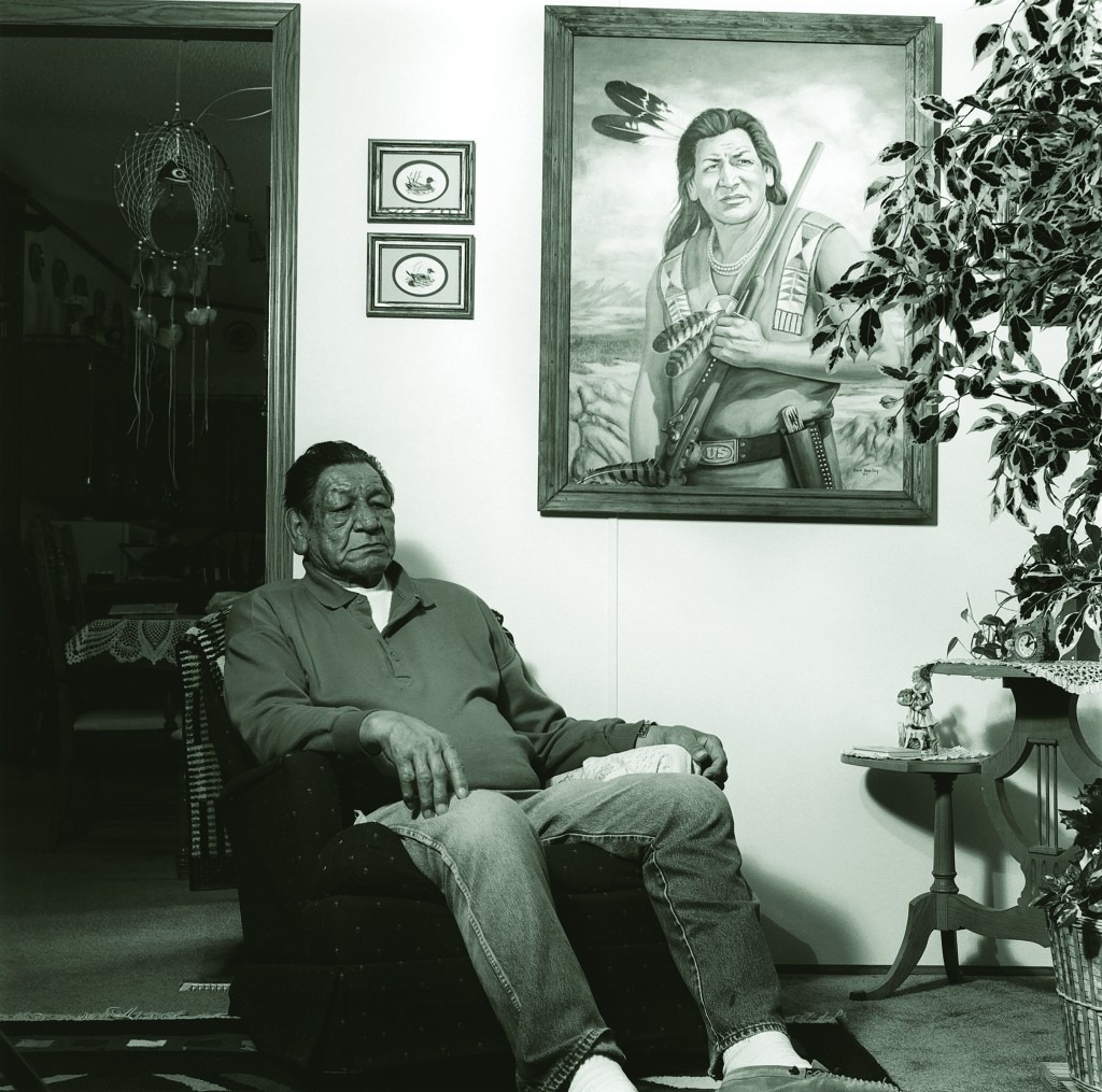 Bill O’Brian (2000) shows an elderly man relaxing in a comfy chair, in a living room, with a dreamcatcher hanging above his head. A painted portrait of a younger man wearing feathers and beads and brandishing a rifle hangs on the wall to his left. Other than the moccasins on his feet, the elderly man’s attire is quintessentially American – blue jeans and a button-up.