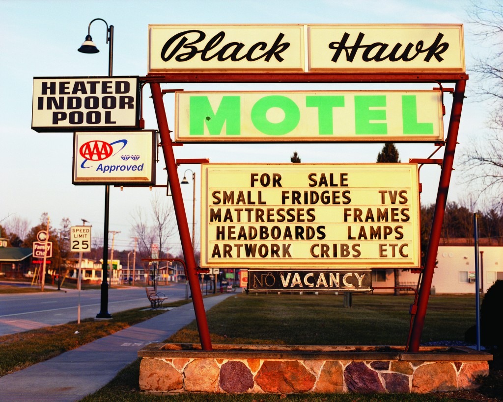 Like the photography of Martin Parr, Jones’s series “Native” Commodity re-presents the world around him with witty irony. Black Hawk Motel (2006) shows an aged, retro-futuristic-looking roadside sign advertising the liquidation of items like ‘SMALL FRIDGES,’ ‘MATTRESSES’ and ‘TVS’. Off-camera, we’re led to believe that the aging motel is going out of business.