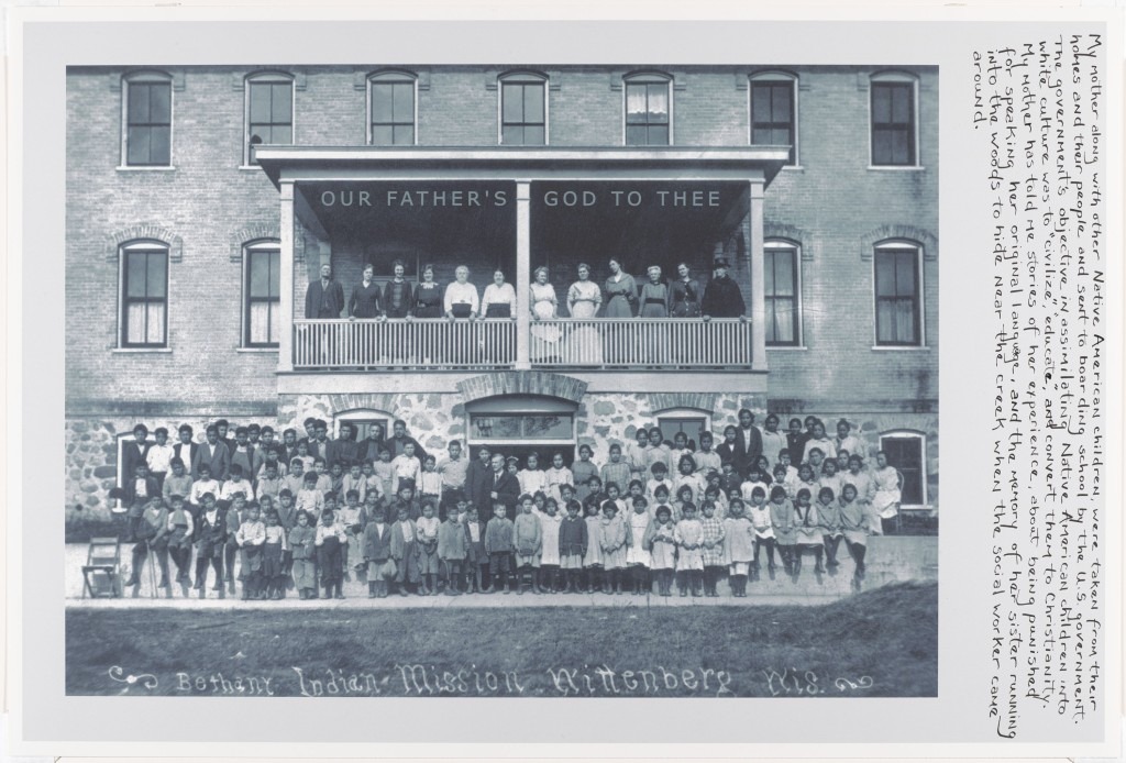 At the bottom of the image is text that appears contact-printed into the photographic paper and reads, ‘Bethany Indian Mission Wittenberg Wis.’ In the area above the children, on the balcony, stand the school’s headmasters. Jones adds text above their heads that reads, ‘OUR FATHER’S GOD TO THEE.’ In the margin of the image is a hand-written account of what his mother endured.