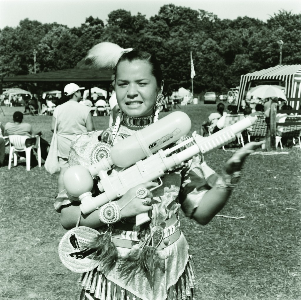 Dorothy Crowfeather (1999) is a snapshot of a young girl cheesing for the camera. She’s head-to-toe in Ho-Chunk regalia with her neck and waist wrapped tightly with beads strung in triangular patterns. She stands in an open field that looks like it holds soccer games when it’s not hosting a pow-wow. We see a crowd of people behind her sitting in folding chairs and seeking refuge from the Sun under pop-up tents. In her hands is a Super Soaker 100 – the weapon of choice for children growing up during the 1990s.