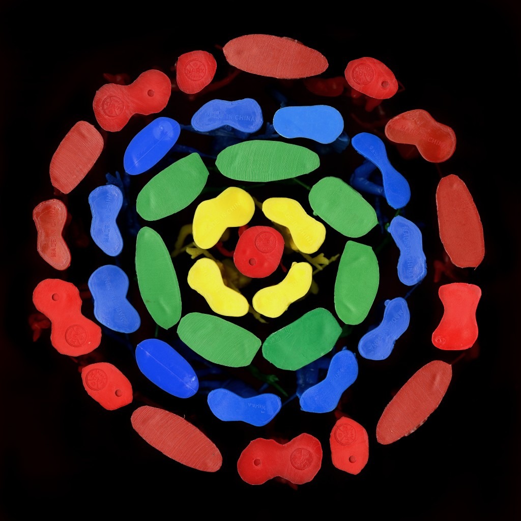 For this series, Jones used a flatbed scanner to capture the bottom side of miniature figurines from children’s cowboys-and-Indians playsets. As we all remember, the miniature legs of the small figurines in those playsets were adhered to a flat, globular-shaped foundation so they could stand upright while enacting imaginary battles. But the battles play out somewhere off-camera in this series because all we see are the zoomed-in, abstract shapes and the vibrantly saturated, childlike color palette created by viewing the figurines from underneath.