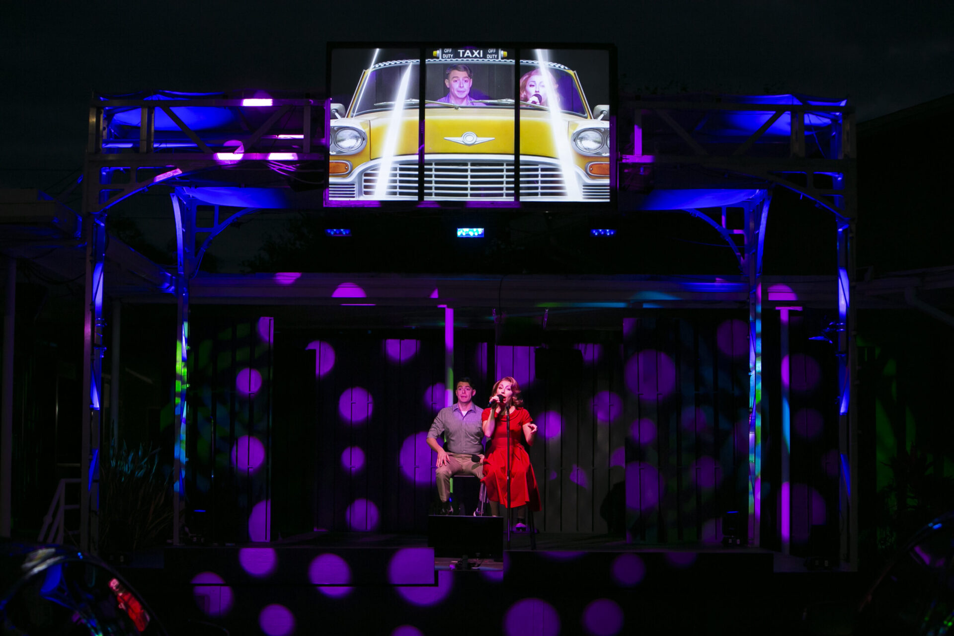 Where “business as usual” in theatre usually involves smoke and mirrors and wonderful stage tricks, some of that becomes difficult in an outdoor theatre experience during a pandemic. While theatres aren’t exactly ‘stripping’ shows down to bare bones, they have welcomed audiences into their processes through lovely and creative avenues. The screens the audience watches are how the drive-in concert experience is meant to be seen and paints a story. There’s even one moment in the show where the performers are put inside a taxi on screen!