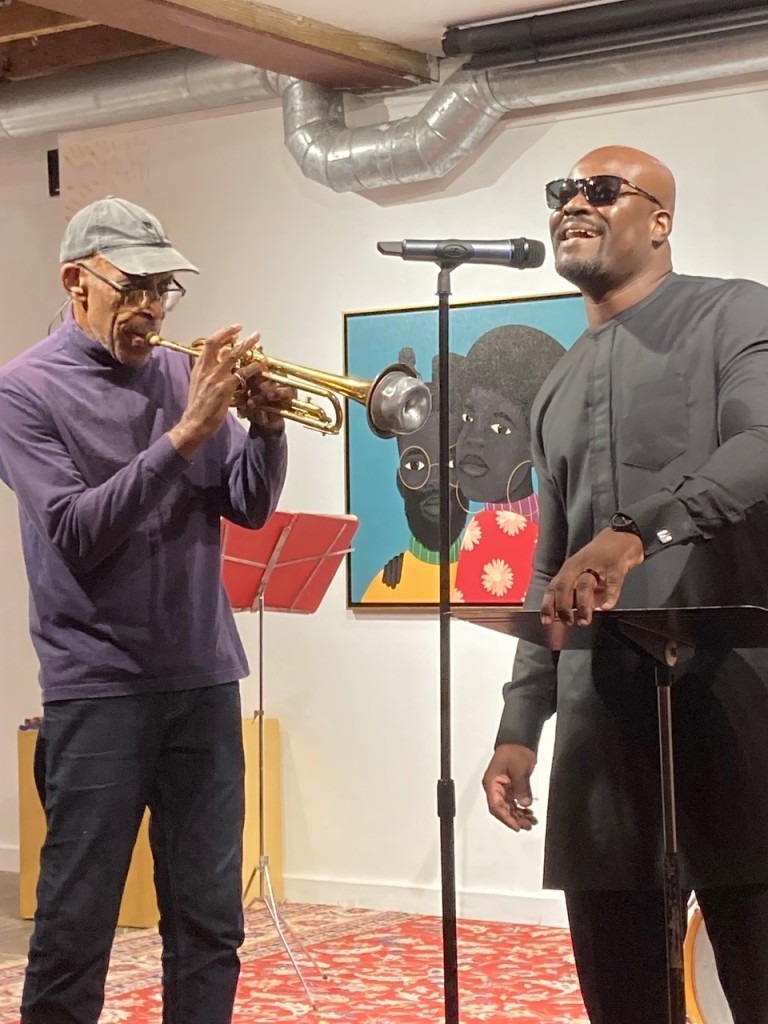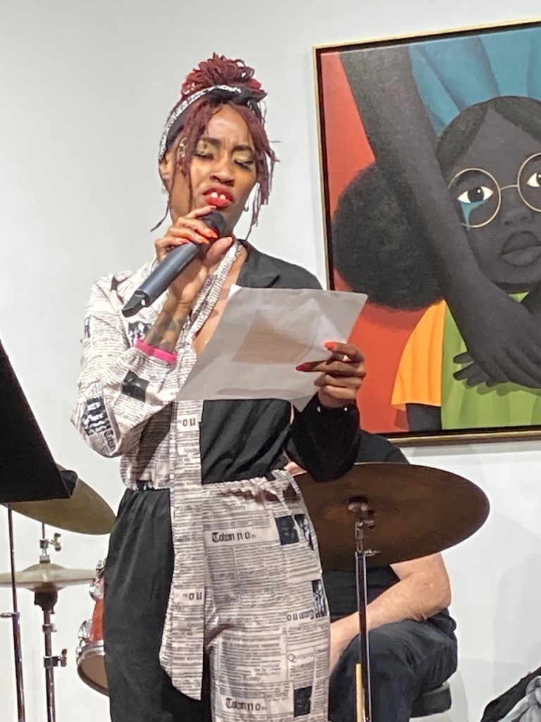 At The Society of Dead Poets open mic fundraiser for the Friends of Jack Kerouac at Studio@6230, Donnie Ibn Malik Ali-McClendon is reciting “Affirmation” by the very much alive poet Cuba-based American fugitive Assata Shakur. Johnnie White is providing the jazzy backdrop on the trumpet. McClendon was one of the co-hosts for the evening of poetry, jazz and an interactive painting experience – photo by Margo Hammond