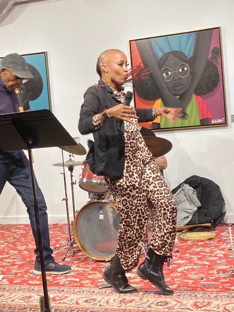 Keesha King, secretary of FOJK, adding a dance step to her reading as Johnny White provides a jazzy backdrop on the trumpet – photo by Margo Hammond