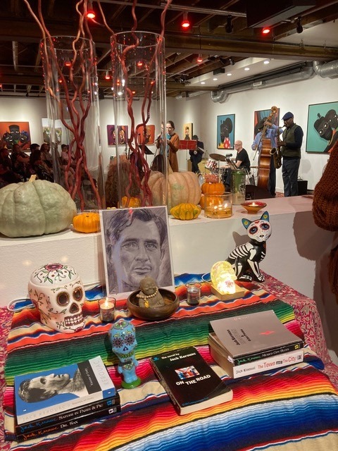 An altar to Jack Kerouac, the dead poet who invented the word Beat, at the Dead Poets Society fundraiser for the Friends of Jack Kerouac with the Johnny White and the Xperince playing jazz in the background – photo by Margo Hammond