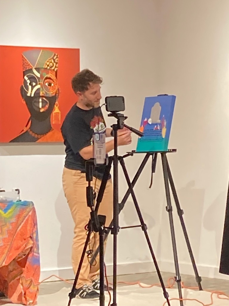 Next, the visual art. Throughout the evening James E Hartzell, past president of the Friends of Jack Kerouac, stood at an easel, painting.
