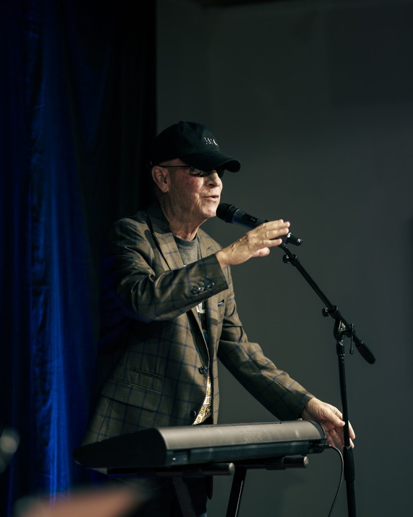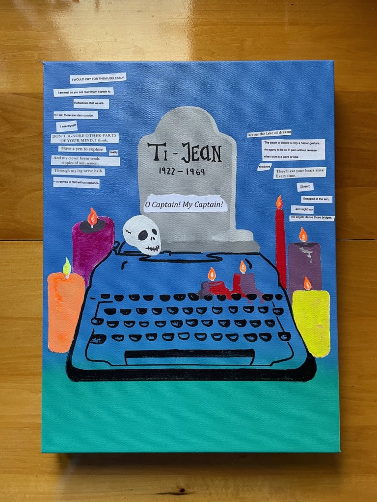 As the image on the canvas emerged —  a typewriter topped by a tombstone labeled with Kerouac’s nickname Ti-Jean and the dates of his life on earth, 1922-1969 — he invited the audience to come up and paste poetry on the work, turning it into an interactive collage. The finished painting will be put up for auction at the next FOJK in March 2023.