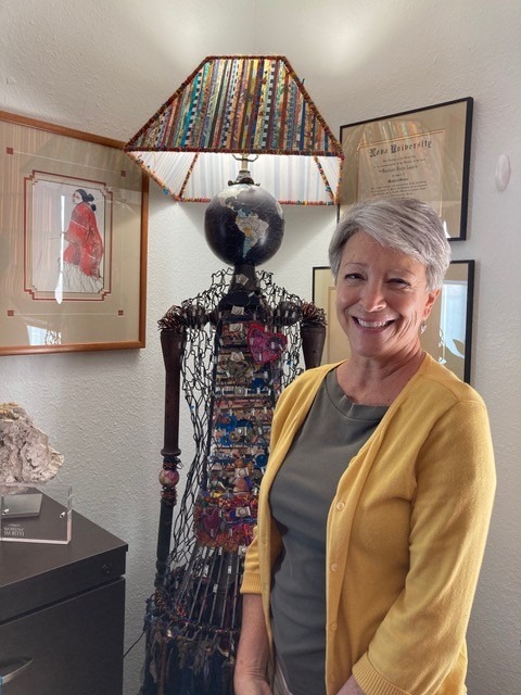 Barbara Rhode, founder of the Red Tent Women’s Initiative, next to a lamp sculpture donated to the organization by artist Robin Roth Murphy. Made from repurposed, reconstructed objects, the life-size piece is entitled Sangha, which, appropriately, means community in Hindi – photo by Margo Hammond