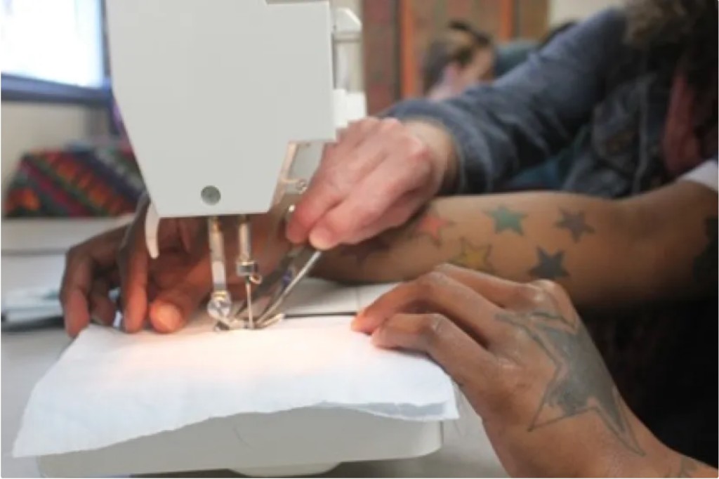 Rhode’s staff includes a part-time instructor (Diane Distelcamp) who teaches the women sewing skills. Most of the work is done by hand, but there are some sewing machines available (donated by PTEC) for those who become particularly proficient. Two full-time facilitators (Meg Hogan Scott and Katherine Coulson) provide the women with tools to handle trauma (using a program called HeartMath) and help them connect the dots between their past abuse and their present behavior.