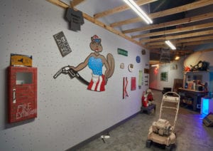 Now it’s Ash Lester’s garage! Stoop under the partially rolled-up garage door and enter this elongated space. Like many real life garages that no longer have room for cars, the space has been converted for other purposes. A hint of Pee-wee Herman’s playhouse, — but many years later, it’s a garage with his tools, guns, workbench, trophies, lawnmower, fridge, fantasies, knickknacks and stuff of everyday. Objects, while retaining some original semblance, are all a bit morphed and distorted.