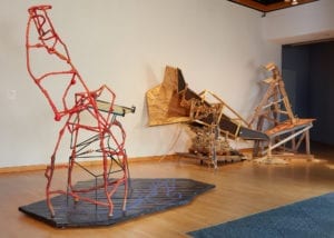 To the right as one enters the museum, Kyle Timberman installed three awkwardly balanced sculptures/structures so contrasting to each other in materials, scale and form, that they very much belong together.