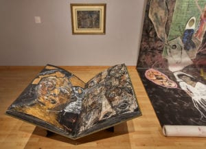 Next to this sits a gigantic bookstand holding a gigantic book. Behind this hangs a smaller painting. These three pieces makes up a portrait of the artist, born of an ancient land, whose book, textures, primal drawings and somber colors tells a complex story, like tangled roots reaching deep into the Earth.