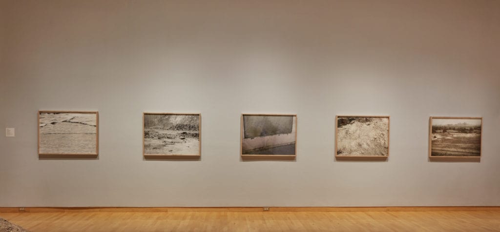 Mohsen Azar hangs five photographs on another wall.  Desert scape? Sand, sand and more sand.